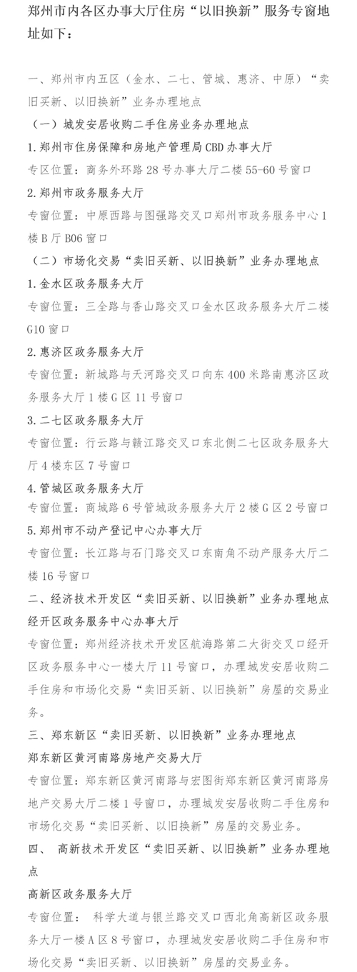 7月16日,記者從鄭州市房管局獲悉,為促進(jìn)該市房地產(chǎn)市場“賣舊買新、以舊換新”政策進(jìn)一步落實(shí),鄭州市房管局會(huì)同稅務(wù)、不動(dòng)產(chǎn)登記等部門,認(rèn)真梳理工作流程、全面開設(shè)服務(wù)專區(qū),全力推進(jìn)住房“以舊換新”工作。目前,鄭州市內(nèi)8區(qū)10個(gè)辦事大廳均開設(shè)“以舊換新”服務(wù)專窗,辦理相關(guān)業(yè)務(wù)可享受“專人專窗”的服務(wù)。
