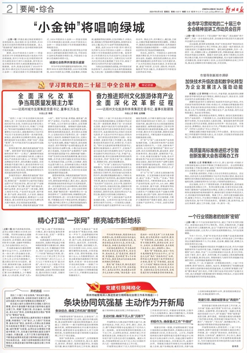“黨的二十屆三中全會把深化國企改革納入進一步全面深化改革戰(zhàn)略、推進中國式現(xiàn)代化全局,為國有企業(yè)在新征程上改革轉(zhuǎn)型指明了前進方向,明確了工作重點。”鄭州城市發(fā)展集團有限公司黨委書記、董事長萬永生表示,城發(fā)集團將以習(xí)近平總書記關(guān)于全面深化改革的一系列新思想、新觀點、新論斷和全會精神為指導(dǎo),通過戰(zhàn)略性重組和專業(yè)化整合,苦練“內(nèi)功”,筑強“筋骨”,爭當中國式現(xiàn)代化建設(shè)鄭州實踐的主力軍。