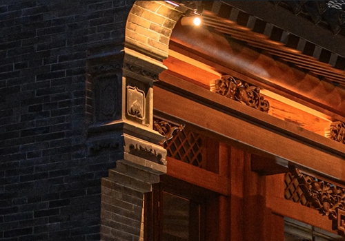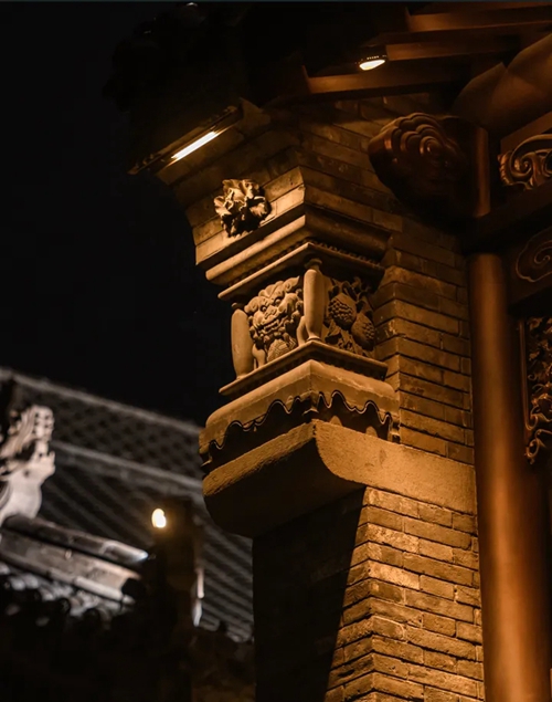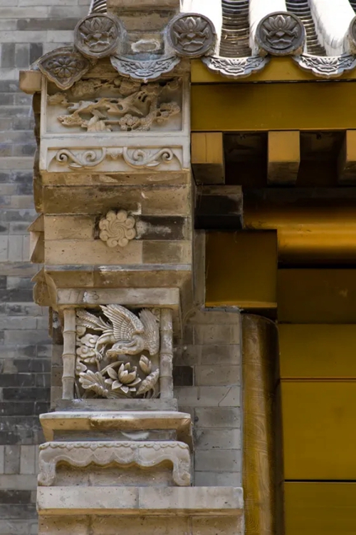 與之相對的17號樓主題為仙鶴,主題靈感來自于“仙鶴的故鄉(xiāng)”鶴壁。建筑上精美的墀頭也表達了此棟院子的主題,其上段位仙鶴,寓意松鶴延年,墀頭下端位仙鹿,寓意福祿綿長。而這處雕刻精美又涵義豐富的墀頭設計來源于河南鶴壁的古城摘星臺公園。
