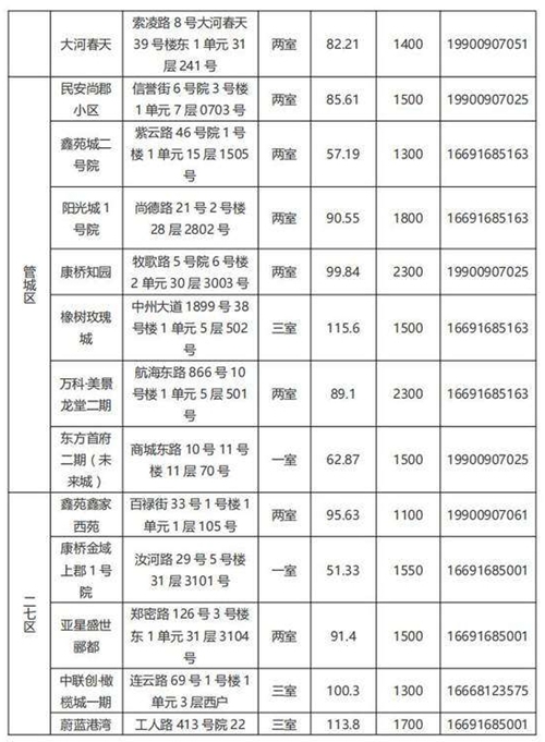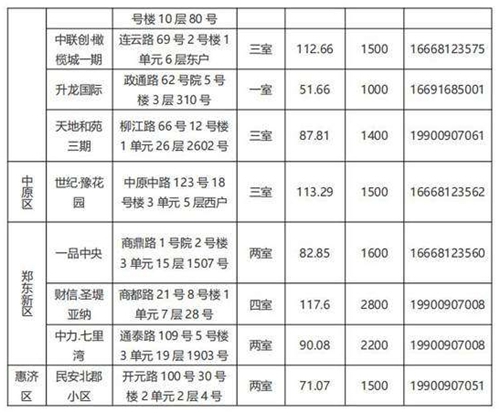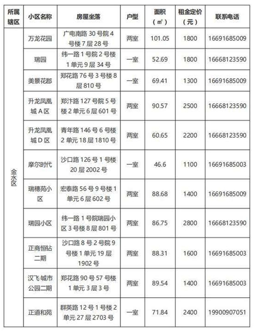 本批次配租房源共計32套,其中金水區(qū)12套、管城區(qū)7套、二七區(qū)8套、中原區(qū)1套、鄭東新區(qū)3套、惠濟區(qū)1套。水電費均為民用水電標(biāo)準(zhǔn),物業(yè)費為各小區(qū)物業(yè)收費標(biāo)準(zhǔn),房源精裝修交付,周邊配套設(shè)施齊全,配備家具家電,拎包入住,后續(xù)房源將根據(jù)裝修進(jìn)度情況陸續(xù)配租。