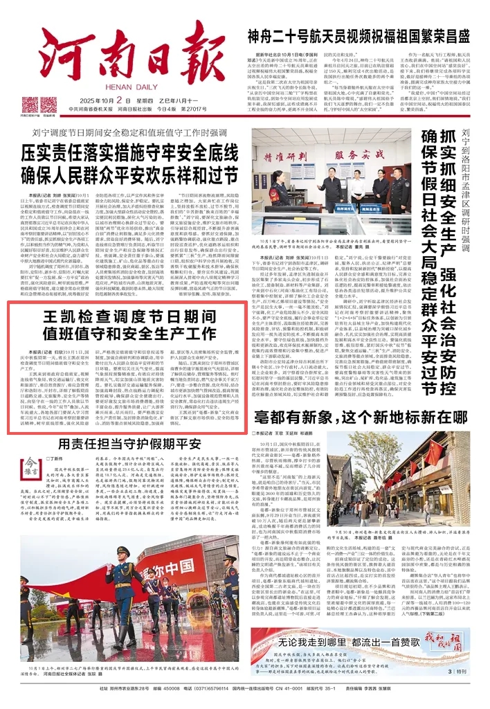 王凱來到省政府總值班室,視頻連線省氣象局、省交通運輸廳、省文化和旅游廳、省自然資源廳、省應(yīng)急管理廳和洛陽市、開封市,詳細了解假期首日道路交通、文旅服務(wù)、安全生產(chǎn)等情況,向堅守在一線的工作人員致以節(jié)日問候。他說,今年“雙節(jié)”疊加,人流車流量大,各地各部門要深入學習貫徹習近平總書記在河南考察時重要講話精神,樹牢底線思維,強化風險意識,嚴格落實值班值守和信息報送等制度,加強會商研判和協(xié)調(diào)聯(lián)動,用辛勤付出為人民群眾創(chuàng)造平安祥和的節(jié)日環(huán)境。要密切關(guān)注天氣變化,提高氣象預報預警精準度,有效應(yīng)對持續(xù)降雨天氣,切實加強山洪地質(zhì)災(zāi)害防范。要扎實做好交通運輸服務(wù)保障,加強高峰時段、熱點線路運力調(diào)配和管控疏導,確保群眾安全便捷出行。要更好激發(fā)文旅市場消費潛能,持續(xù)豐富業(yè)態(tài),提升服務(wù)質(zhì)量,讓廣大游客乘興而來、盡興而歸。要嚴格落實安全生產(chǎn)責任制,及時排查消除危化、礦山、消防等重點領(lǐng)域風險隱患,加強商超、景區(qū)等人員密集場所安全監(jiān)管,維護人民群眾生命財產(chǎn)安全。