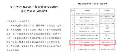 近日,鄭州市物業(yè)管理協(xié)會官網(wǎng)發(fā)布《關于2025年鄭州市物業(yè)管理示范項目評價結果公示的通知》,城發(fā)·金岱智慧產(chǎn)業(yè)園獲評“鄭州市物業(yè)管理示范項目”。