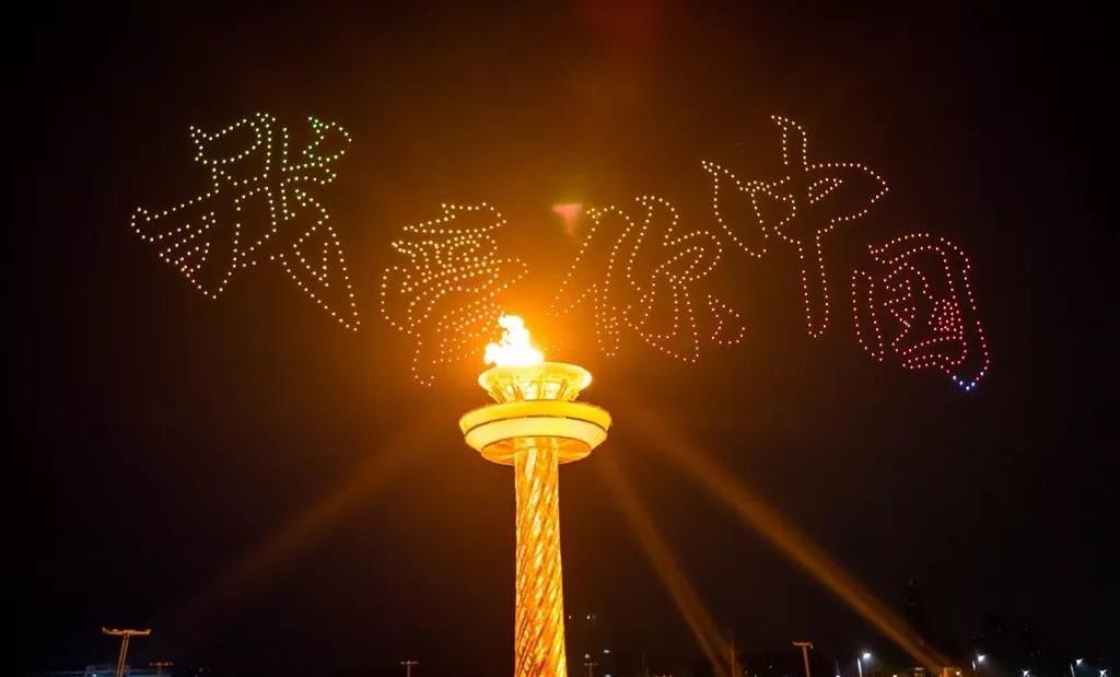 當現場屏幕通過虛擬技術應用,呈現出美麗的畫面,讓現場觀眾仿佛置身北國北川、南嶺飛瀑之中,觀眾都情不自禁地揮舞起了手中的國旗為他們的表演喝彩!為我們偉大的祖國喝彩!1000架無人機從奧體中心廣場升起迅速變換成中中的造型,點燃民族運動會的火炬。