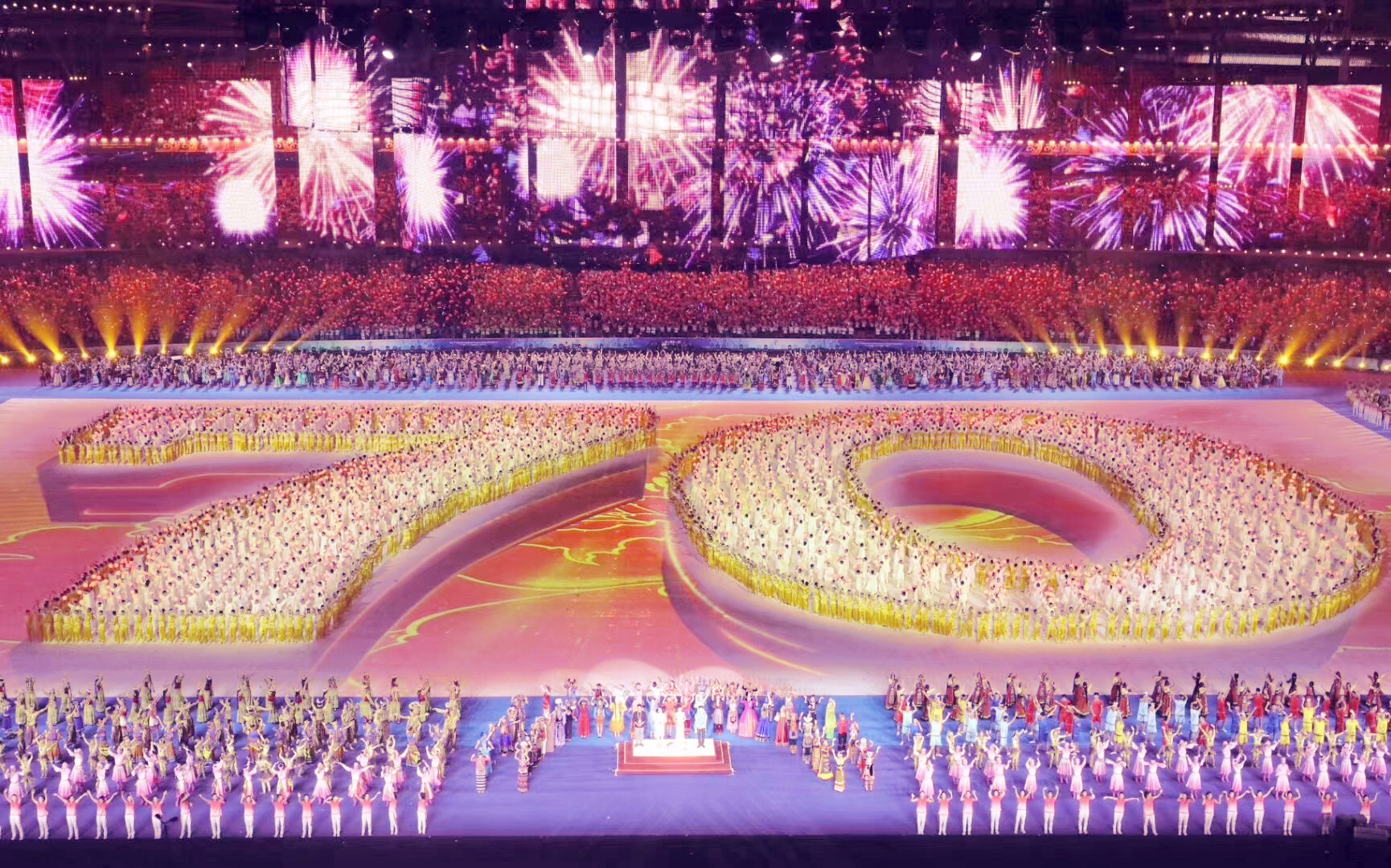 各族同胞滿懷深情,一同唱響《我和我的祖國》。場內出現象征新中國七十華誕的數字“70”,共同祝福偉大祖國繁榮昌盛。