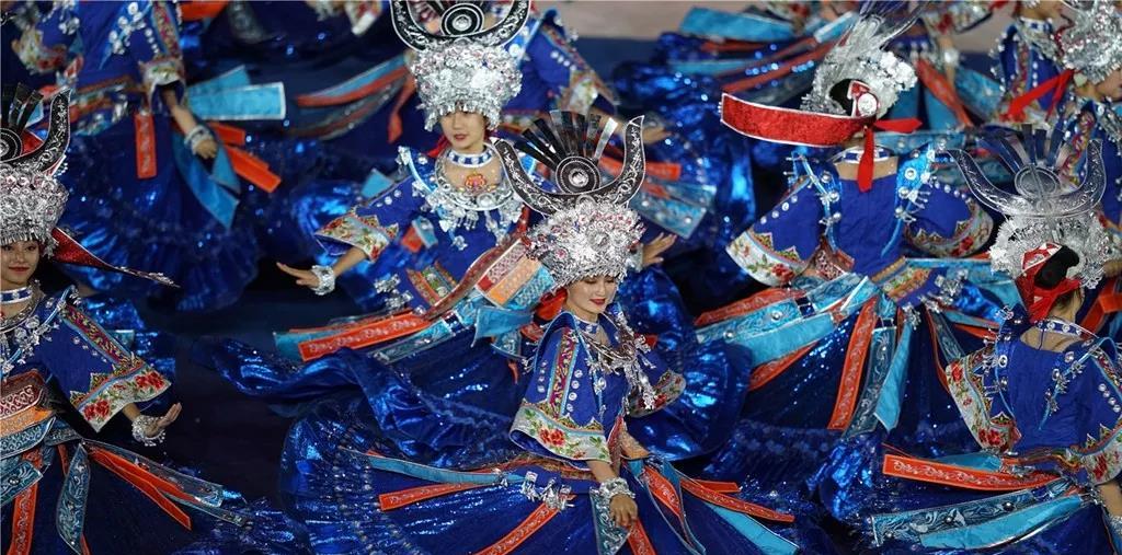 各民族運動員身著民族盛裝,精神抖擻,闊步走來。各代表團行進中30秒的駐停表演,展示了中華文化百花園的絢麗多姿,讓現場觀眾贊嘆沉醉。