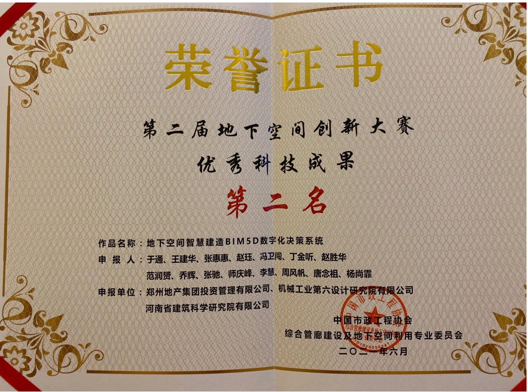 日前,鄭州地產(chǎn)集團(tuán)投資管理公司參賽作品《地下空間智慧建造BIM5D數(shù)字化決策系統(tǒng)》榮獲“全國地下空間創(chuàng)新大賽優(yōu)秀科技成果”第二名。