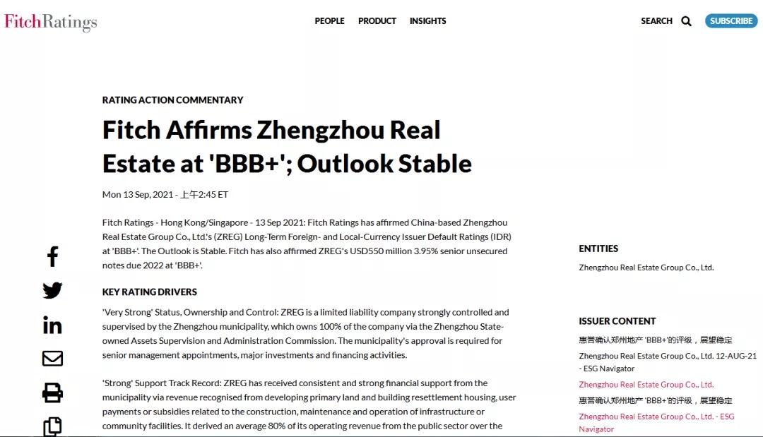 2021年9月13日,惠譽(yù)國(guó)際評(píng)級(jí)確認(rèn)鄭州地產(chǎn)集團(tuán)有限公司(簡(jiǎn)稱(chēng):鄭州地產(chǎn))發(fā)行人評(píng)級(jí)為“BBB+”,展望穩(wěn)定。